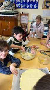 A l’occasion de l’Épiphanie, la classe de CP/CE1 s’est transformée en véritable pâtisserie! Les élèves ont préparé deux galettes des rois avec beaucoup d’enthousiasme.